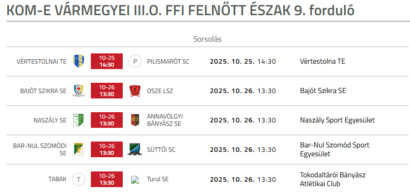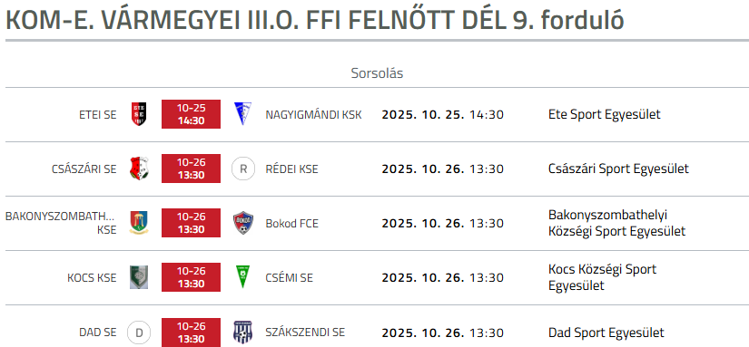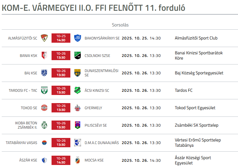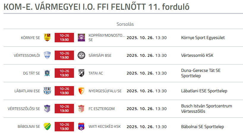 A vármegyei első osztály 11. fordulójában egy szomszédvári mérkőzés lesz megtekinthető. A tizedik helyen álló Lábatlani ESE fogadja vendégül az ötödik helyen álló Nyergesújfalu SE csapatát. A mérkőzés vasárnap 13:30-kor kezdődik a lábatlani sportpályán. A vármegyei másodosztályban egy igazi rangadó következik. Az második helyen álló Ászár KSE fogadja vendégül az első helyezett Mocsa KSE csapatát. A mérkőzés vasárnap 13:30-kor kezdődik az ászári sportpályán. A harmadosztály déli és északi csoportjában a 9. forduló következik a hétvégén szombati és vasárnapi játéknapokon.