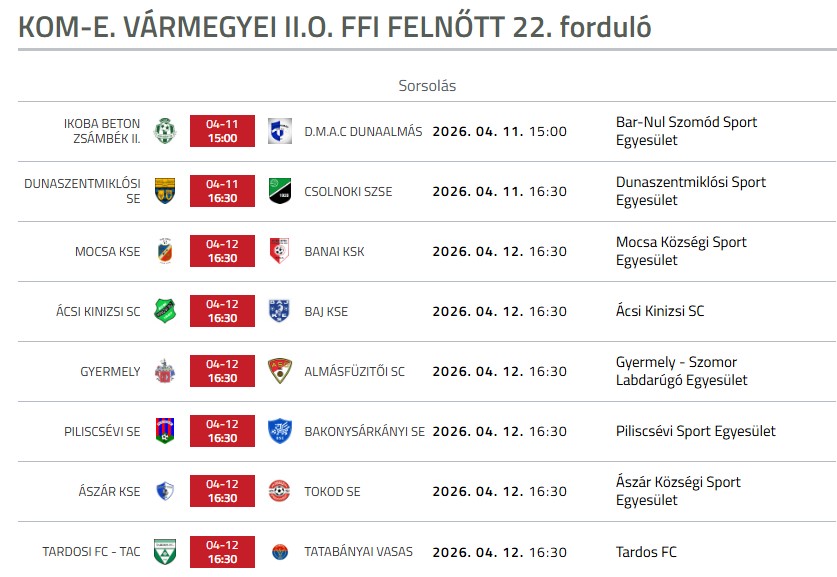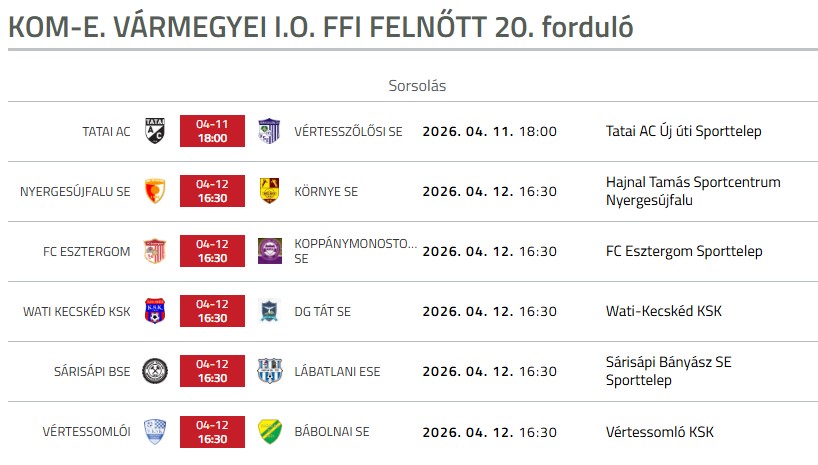 A vármegyei I. osztály 20. fordulójában rangadó is színesíti a programot: a harmadik helyen álló Bábolnai SE hazai pályán fogadja a negyedik Vértessomló együttesét. Szintén kiélezett összecsapás ígérkezik, ahol a hatodik helyezett Wati Kecskéd KSK látja vendégül a mindössze két ponttal lemaradó, hetedik DG Tát SE csapatát. A területi I. osztály alapszakaszából még három forduló van hátra, így a Kecskéd-Tát mérkőzés sorsdöntő lehet. Az alapszakasz után rájátszás fog következni.