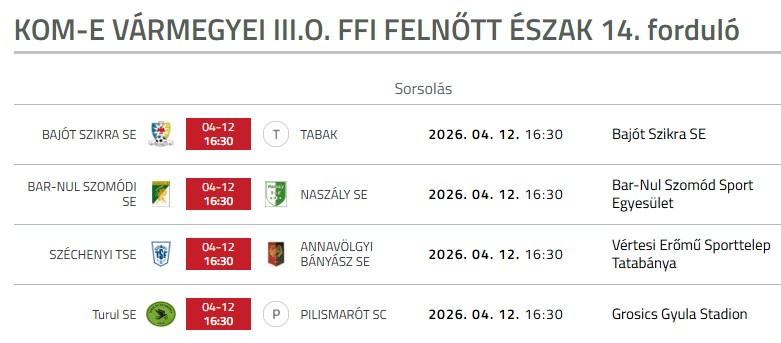 A III. osztály északi csoportjában rangadó következik: az éllovas BAR-Nul Szomódi SE a harmadik helyen álló Naszály SE-t fogadja, ami komoly hatással lehet az élmezőny sorrendjére.