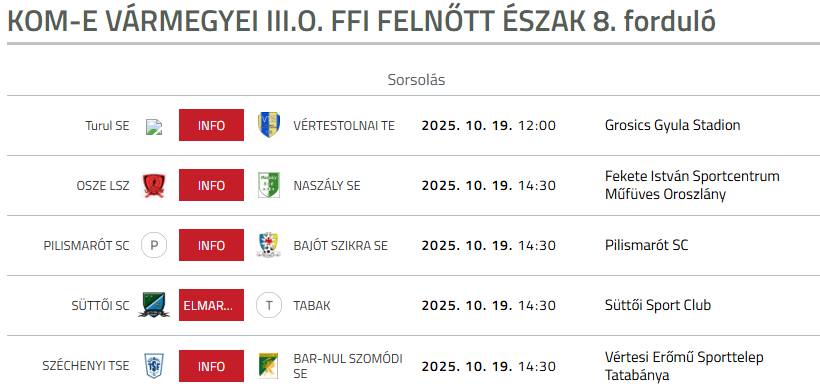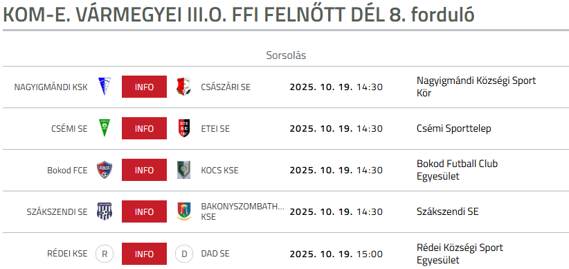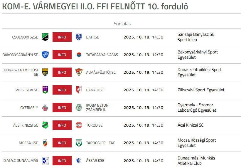 A vármegyei első osztályban első helyen álló Koppánymonostori SE fogadja vendégül a harmadik helyezett Bábolnai SE csapatát. A mérkőzés szombaton 14:30-kor kezdődik a koppánymonostori sportpályán. Szomszédvári rangadó is megrendezésre kerül vasárnap, ahol a WATI Kecskéd KSK fogadja vendégül a Vértessomlói KSK csapatát. A vármegyei másodosztályban szintén egy izgalmas rangadó következik. Az első helyen álló Mocsa KSE fogadja vendégük a második helyezett Tardosi FC-TAC csapatát. A területi harmadosztály déli csoportjában az második helyezett Csémi SE fogadja vendégül az első helyen álló Etei SE csapatát. Az északi csoportban az első helyezett BAR-NUL Szomódi SE vendégeskedik a második helyen álló Széchenyi TSE csapatánál.
