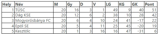 A második helyen álló Dág csapata stabil teljesítményt nyújt, azonban az éllovas előnye jelentős. A dobogó harmadik fokáért viszont rendkívül szoros a verseny: bár jelenleg Mogyorósbánya áll kedvező pozícióban, a Kesztölc és Epöl csapatai is komoly eséllyel pályáznak a bronzéremre.