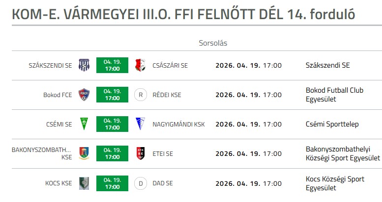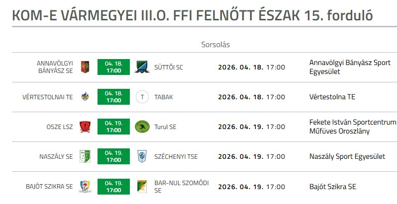 A harmadosztály déli csoportjában a harmadik Szákszendi SE a Császár SE-t fogadja, ahol a vendégek akár fel is léphetnek a dobogóra. Az északi csoportban is komoly téttel bíró mérkőzések következnek: a negyedik Naszály SE a második Széchényi TSE ellen játszik, míg az Annavölgyi BSE a Süttő SC-t fogadja – mindkét párharc szorosan alakulhat, és hatással lehet az élmezőny sorrendjére.
