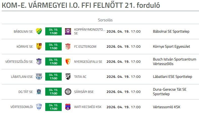 A vármegyei I. osztály 21. fordulójában igazi csúcsmeccsek várnak ránk. A harmadik helyezett Bábolnai SE a második Koppánymonostori SE-t fogadja, ahol kulcsfontosságú pontok sorsa dőlhet el a dobogóért folytatott harcban. Szomszédvári rangadóból sem lesz hiány: a negyedik Vértessomlói KSK a hatodik WATI Kecskéd KSK ellen lép pályára, a felek között mindössze két pont a különbség.