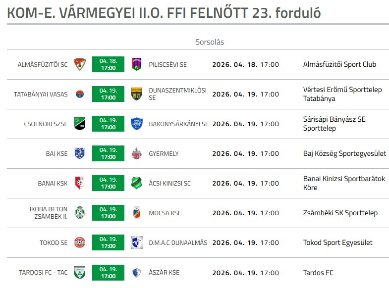 A másodosztályban is kiélezett összecsapások következnek. Az éllovas Tardosi FC-TAC a negyedik helyen álló Ászár KSE-t látja vendégül – köztük csupán három pont a differencia. Szintén rangadó várható Zsámbékon, ahol a harmadik helyezett csapat fogadja a második Mocsa KSE-t; a két együttes között mindössze egy pont van, így a találkozó az élmezőny alakulását is jelentősen befolyásolhatja. Az Ácsi Kinizsi SC Bana KSK-hoz látogat, míg Dunaalmás Tokodon vendégszerepel – ezek a mérkőzések a középmezőny szempontjából lehetnek meghatározóak.